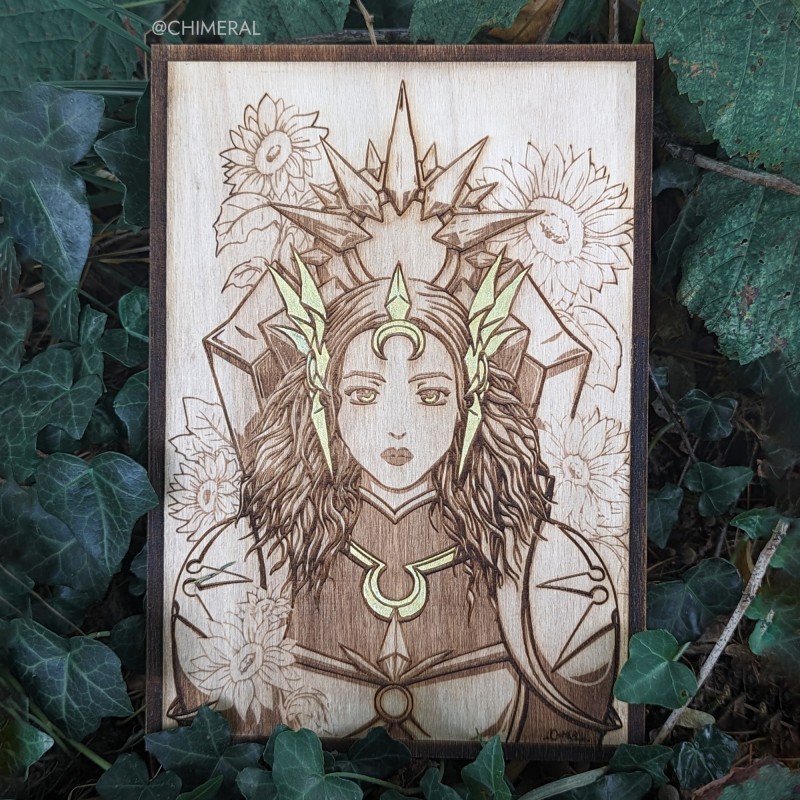 Hand-drawn fanart inspired by Leona, character from the game the League of Legends. Laser cut wood engraving.