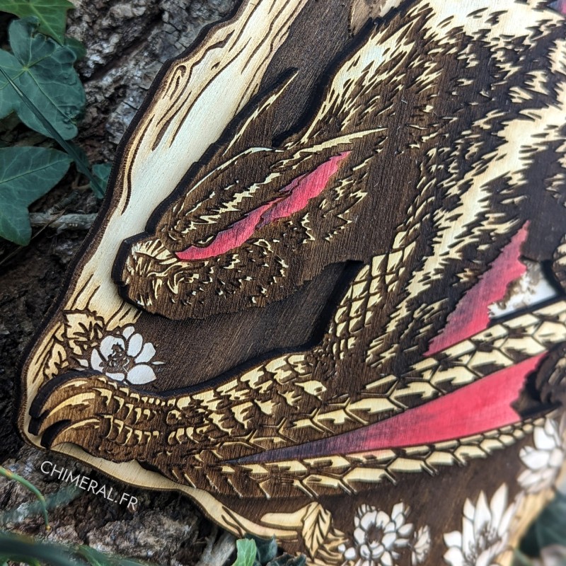 Hand-drawn fanart inspired by Zinogre from the game Monster Hunter. Laser cut wood engraving.