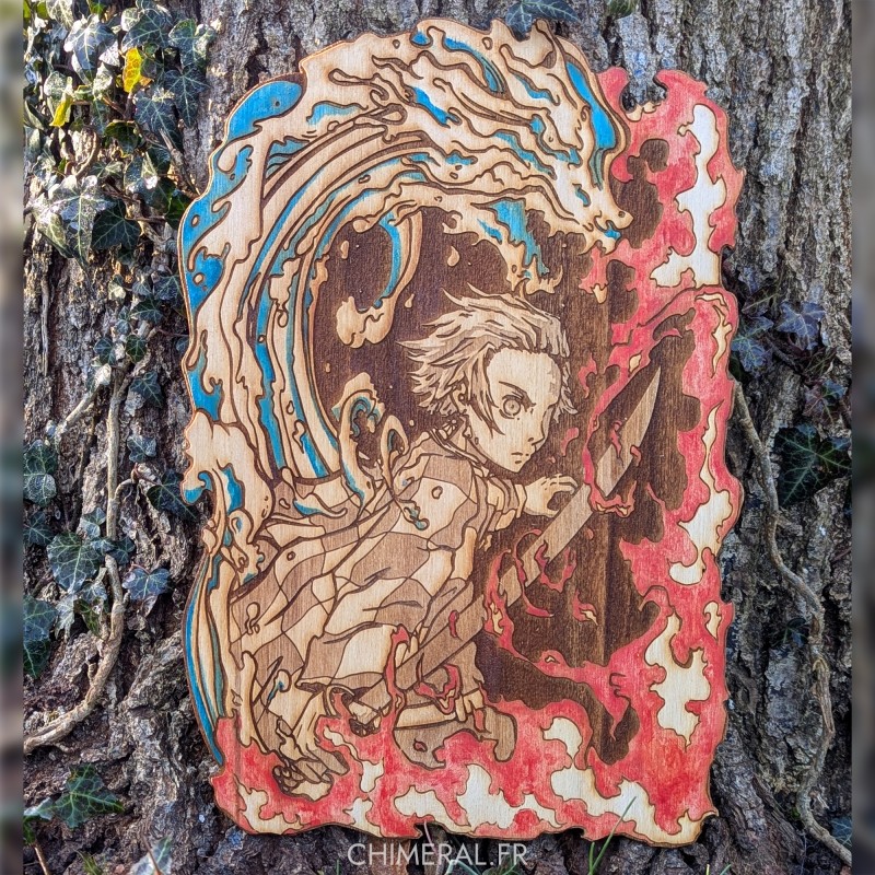 Hand-drawn fanart inspired by Tanjiro from Demon Slayer. Laser cut wood engraving.