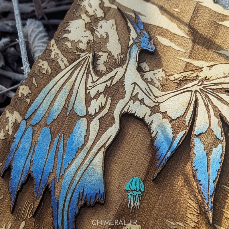Hand-drawn fanart with indian ink, inspired by Legiana from the game Monster Hunter. Laser cut wood engraving.