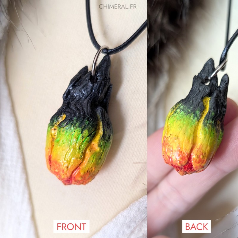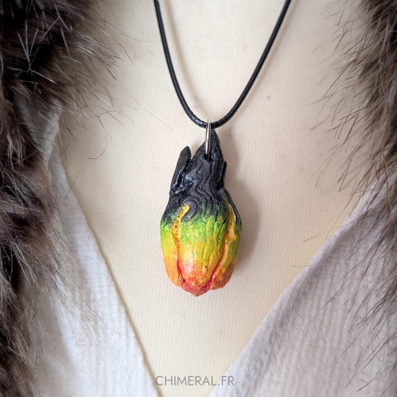 Collier inspiré du Brachydios Tempête, monstre du jeu Monster Hunter. Écaille sculptée et peinte à la main.