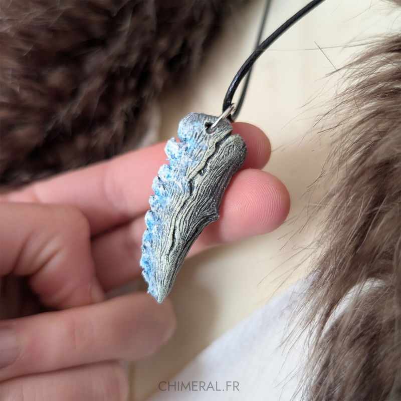 Collier inspiré du Barioth Crocgivre, monstre du jeu Monster Hunter. Écaille sculptée et peinte à la main.